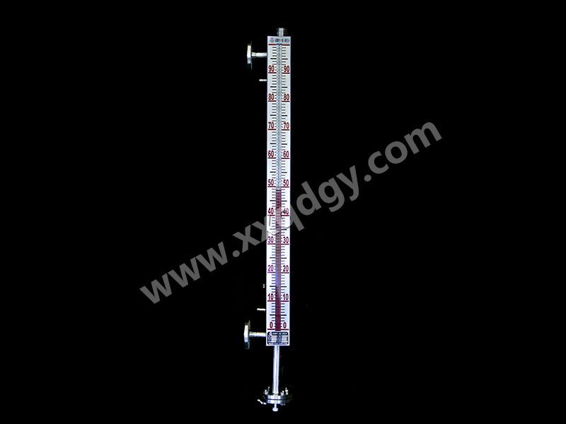 液位計(jì)根據(jù)浮力原理和磁性耦合作用原理工作。當(dāng)被側(cè)容器中的液全升降時(shí),液位計(jì)主導(dǎo)管中的浮子也隨之升降,浮子內(nèi)的磁鋼通過(guò)磁耦合傳遞到現(xiàn)場(chǎng)指示器,驅(qū)動(dòng)紅白翻柱翻轉(zhuǎn)180°,當(dāng)液位上升時(shí),翻柱由白色轉(zhuǎn)為紅色,當(dāng)液位下降時(shí),翻柱由紅色轉(zhuǎn)為白色,指示器的紅、白界位處為容器內(nèi)介質(zhì)液位的實(shí)際高度,從而實(shí)現(xiàn)液位的指示。加裝限位開(kāi)關(guān)實(shí)現(xiàn)液位報(bào)警與控制,加裝變送器實(shí)現(xiàn)標(biāo)準(zhǔn)信號(hào)輸出供顯示與控制。