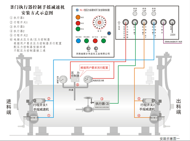 1.將主控箱安裝在便于觀察操作、防水防雨的地方,接通AC220V電源。將三通(壓力控制需配四通)安裝在進料端釜門上部原壓力表處。